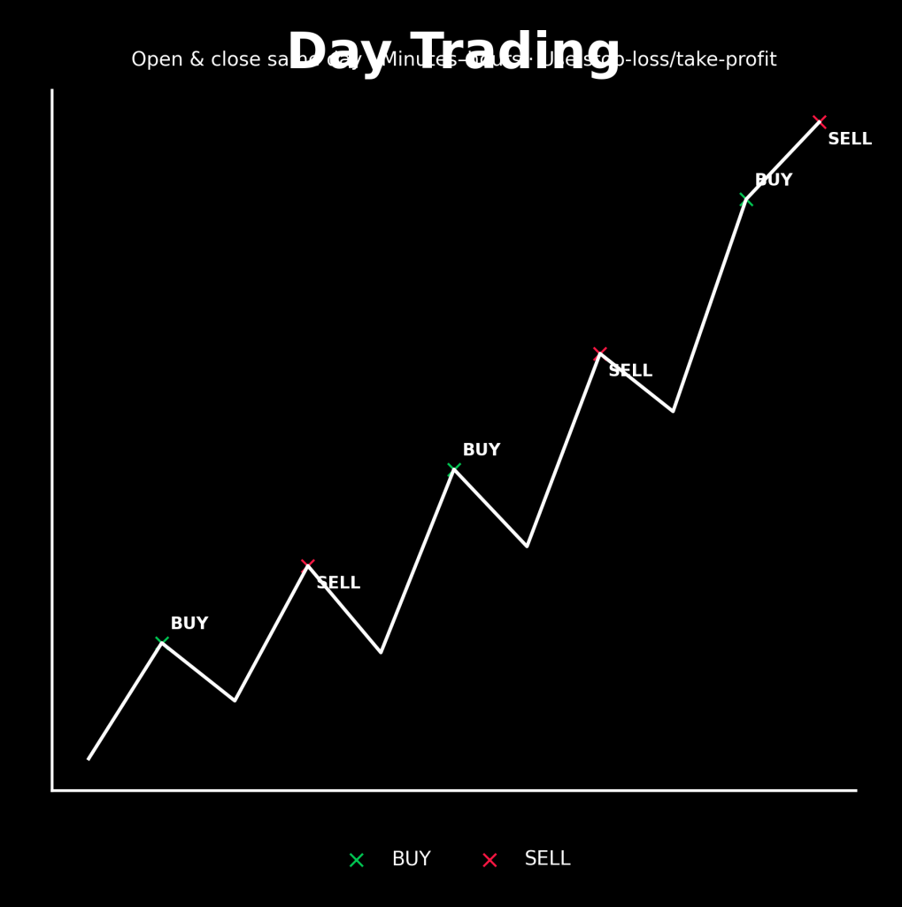 Day Trading means opening and closing positions within the same day to benefit from short-term price moves. Traders rely on technical analysis to read trends, often using stop-loss orders to limit risk.