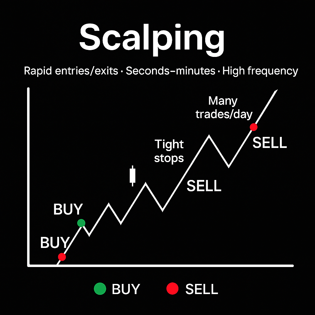 Scalping is a high-frequency approach that aims to capture very small price moves over very short time frames (minutes or even seconds). Scalpers often place dozens of trades per day. This method requires strong technical analysis skills and fast decision-making.